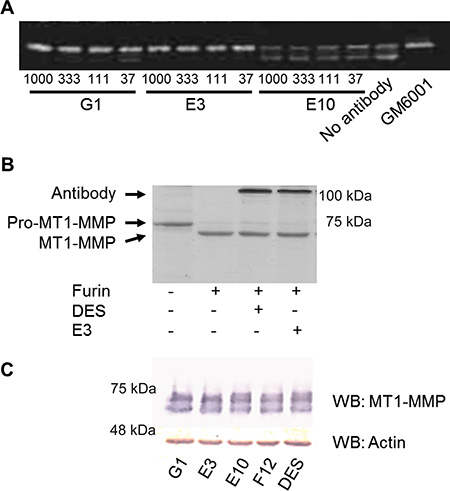 Figure 4: Fc-scFv’s inhibit activation of pro-MMP-2, but not activation of pro-MT1-MMP. (A) For pro-MMP-2 activation assays, HT-1080 cells were cultured in the presence of trace amounts of collagen type I in the absence or presence of MT1-MMP Fc-scFv’s or GM6001. Following 18 hours of incubation, cell culture supernatant was analysed for levels of pro-MMP-2 and active MMP-2 by zymography. A few lead Fc-scFv’s displayed inhibitory activity as shown by E3 and G1, while the majority did not, as exemplified by E10. The experiments shown are representative of a total of three independent experiments. (B) Full ectodomain Pro-MT1-MMP was incubated with or without furin, and in the presence or absence of DES Fc-scFv control or E3, as indicated, for 3 hours at RT. Reaction products were analyzed by reducing SDS-PAGE, and conversion of pro-MT1-MMP to MT1-MMP by furin was observed. (C) Analysis of HT1080 cell lysates for the presence of MT1-MMP was carried out by Western blotting using anti-MT1-MMP polyclonal antibody N175/6. As a loading control, actin was detected by rabbit anti-actin polyclonal antibody.