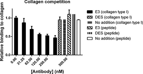 Figure 5: Fc-scFv's compete with collagen type I for binding to MT1-MMP whereas binding of collagen peptide is unaffected. In an ELISA setup, pepsin-extracted collagen type I or collagen peptide were coated in wells after which ectodomain MT1- MMP was allowed to bind in the absence or presence of Fc-scFv E3 or DES control antibody at a concentration of 0-500 nM.