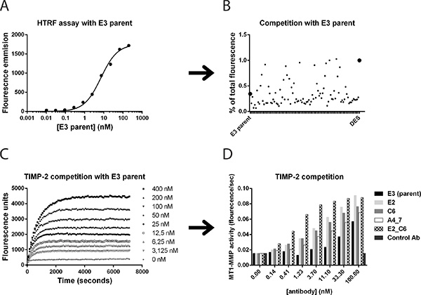 Figure 6: Affinity maturation of lead antibody clones and screening for improved variants. Homogeneous time-resolved fluorescence (HTRF), TIMP-2 competition and surface plasmon resonance assays were utilized to identify affinity improved variants of lead Fc-scFv’s. (A) In HTRF assays, parent E3 binding to MT1-MMP was observed by direct labeling of E3 and detection with labeled streptavidin and biotinylated full ectodomain pro-MT1-MMP. (B) The ability to outcompete labeled parent Fc-scFv E3 from binding to MT1-MMP was detected as a decrease in HTRF signal and displayed as percent of total fluorescence in the absence of competing scFv. (C) Cleavage of small fluorogenic peptide by ectodomain MT1-MMP was inhibited by TIMP-2. E3 Fc-scFv E3 outcompeted TIMP-2 inhibition of MT1-MMP, as shown by increasing E3 concentrations from 0–400 nM. (D) The efficacy of improved variants to outcompete TIMP-2 from ectodomain MT1-MMP was directly compared to E3 parent.