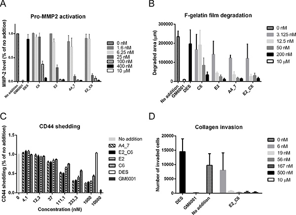 For cell-free gelatin degradation, gelatin was incubated with or without 50 nM catalytic domain MT1-MMP and in the presence of E2-C6 (0–200 nM), DES (200 nM) or GM6001 (10 μm). After incubation, the reaction products was analysed by SDS-PAGE. For quantifying gelatin degradation, the gelatin fragment of 35 kDa was used and analyzed by densitometry.