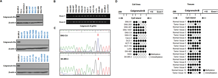 Calgranulin B protein level was analyzed by western blotting in 20 human colon cancer cell lines, two gastric cancer cell lines, one breast cancer cell line, two ovarian cancer cell lines and one cervical cancer cell line. Calgranulin B was not observed in the cancer cell lines tested, excluding the SK-BR-3 breast cancer line (Figure 1A). Genomic DNA (gDNA) PCR performed using SK-BR-3 as a positive control showed that the calgranulin B gene was present in all six colon cancer cell lines randomly selected from 20 cell lines (Figure 1B). Calgranulin B gene promoter methylation status was investigated using methylation-specific PCR after sodium-bisulfite modification. Representative sequence diagrams of the colon cancer cell line SNU-C4 and breast cancer cell line SK-BR-3 are shown (Figure 1C). None of the six CpG sites investigated were methylated in SK-BR-3, but 13 colon cancer cell lines showed at least three methylation sites in the CpG island (Figure 1D, left panel). Calgranulin B promoter regions in all colon cancer patient tissues were also methylated, and hypermethylation was detected in normal tissues (Figure 1D, right panel).