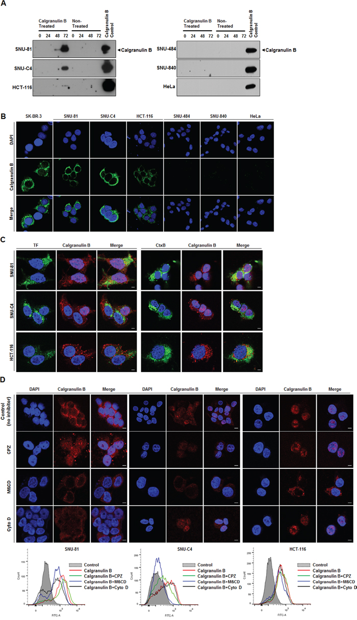 Figure 3: Internalization of extracellular calgranulin B into colon cancer cell lines. A. Western blot analysis performed after the calgranulin B treatment. Colon cancer cell lines (SNU-81, SNU-C4, HCT-116) had internalized calgranulin B at 72 h post treatment (100 nM calgranulin B), but gastric cancer (SNU-484), ovarian cancer (SNU-840) and cervical cancer (HeLa) cell lines had not. B. Confocal microscopy results show internalized calgranulin B in the cytoplasm of colon cancer cells. Nuclei were stained with DAPI. SK-BR-3 was used as a positive control. C. Co-localization of calgranulin B with intracellular endocytosis markers. HCT-116, SNU-C4, and SNU-81 cells were co-treated with 100 nM calgranulin B (red) and 10 μg/ml Alexa 488-transferrin (TF, green in the left panel) or 10 μg/ml Alexa 488-cholera toxin-B (CtxB, green in the right panel). At 2 h post treatment, confocal microscopic analysis was performed. Nuclei were visualized via Hoechst 33342 (blue) staining. Scale bars, 5 μm. D. Effects of endocytosis inhibitory drugs on calgranulin B uptake in colon cancer cell lines. HCT-116, SNU-C4 and SNU-81 cell lines were incubated with calgranulin B (100 nM) for 2 h with or without pretreatment of CPZ (10 μg/ml), MßCD (5 mM) or and Cyto D (1 μg/ml) for 30 min. Calgranulin B internalization was analyzed using confocal microscopy (upper panel) and flow cytometry (lower panel). Scale bars, 5 μm.