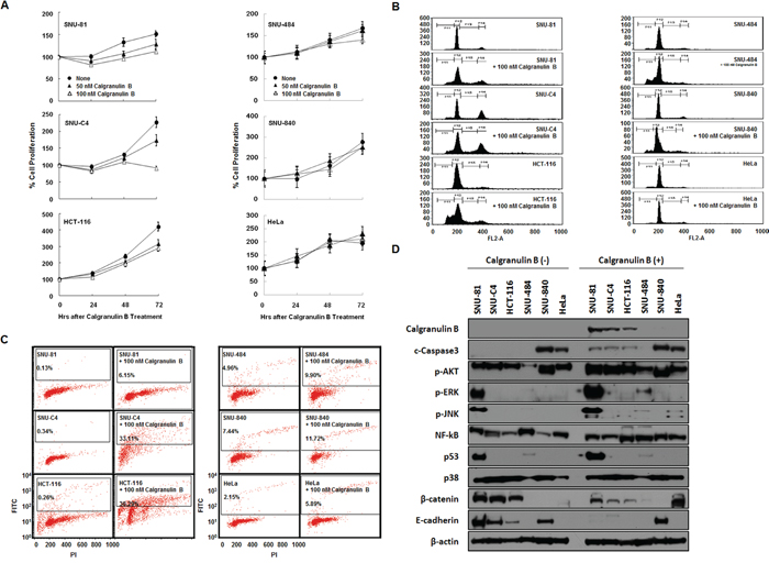Figure 4: Effects of calgranulin B internalization on colon cancer cell lines. A. MTT assay results showed increased cell death in SNU-C4 cancer cells 48–72 h after calgranulin B treatment compared to SNU-81 and HCT-116 cells. B. FACS analysis confirmed cell cycle changes, most significantly arrest at sub-G1 phase, in all tested cell lines (excluding HeLa) at 72 h post calgranulin B treatment (100 nM). C. TUNEL assay showed that apoptosis was effectively increased in colon cancer cell lines at 72 h post treatment. D. At 72 h post calgranulin B (100 nM) treatment, intracellular signaling was assessed using western blot analysis. Total levels of cleaved caspase-3 and p53, as well as phosphorylated AKT, ERK and JNK, were increased after treatment. In contrast, β-catenin and E-cadherin levels were suppressed in colon cancer cells.