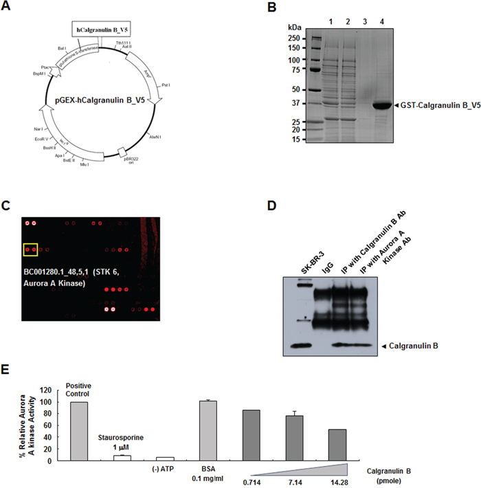 Figure 5: Decreased aurora A kinase activity upon calgranulin B binding. A. Recombinant human calgranulin B V5-tagged vector construction. The recombinant protein was fused with GST at the N-terminus for purification and the V5 tag at the C-terminus for protein–protein interactions. B. SDS-PAGE gel showing the glutathione S-transferase (GST)–human calgranulin B fusion protein purified from E. coli. Lanes 1–4 indicate whole homogenate, GST column flow-through, GST column wash, and eluted fusion protein, respectively. C. In a human protein microarray, aurora A kinase was identified as a calgranulin B binding candidate. D. Immunoprecipitation (IP) of calgranulin B and aurora A kinase confirmed the binding. E. Calgranulin B binding suppressed aurora A kinase activity in a dose-dependent manner.