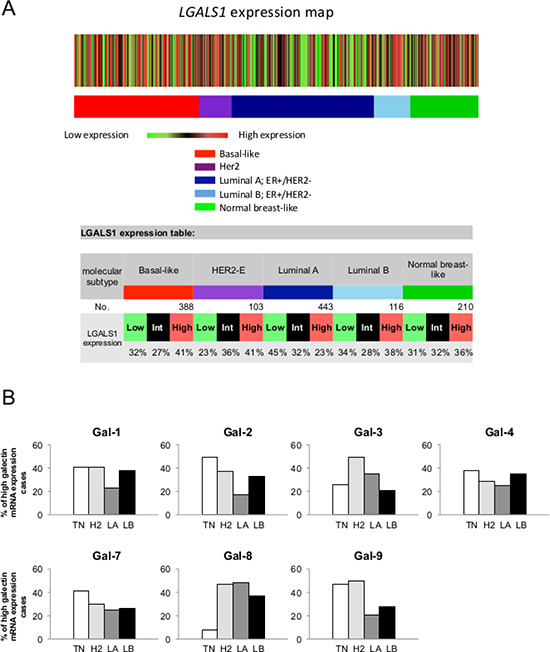 Figure 1: Gene expression map of lgals1 in PAM50 molecular subtypes of breast cancer using bc-GenExMiner database. (A) The map shows the percentage of patients with low, medium and high expression of lgals1 mRNA in each molecular subtype: Basal-like (ER-, HER-2-), HER-2E (HER-2 enriched), Luminal A (ER+, HER-2-, low proliferation) and Luminal B (ER+, HER-2-, high proliferation). The number of patients for each subtypes is shown. (B) The distribution for lgals1, lgals2, lgals3, lgals4, lgals7, lgals8, and lgals9 in each molecular subtypes.