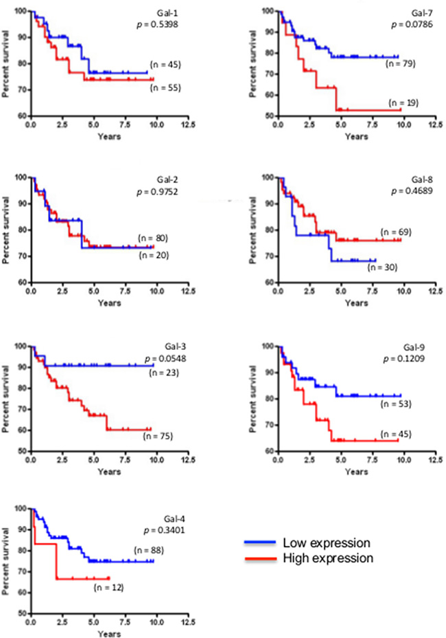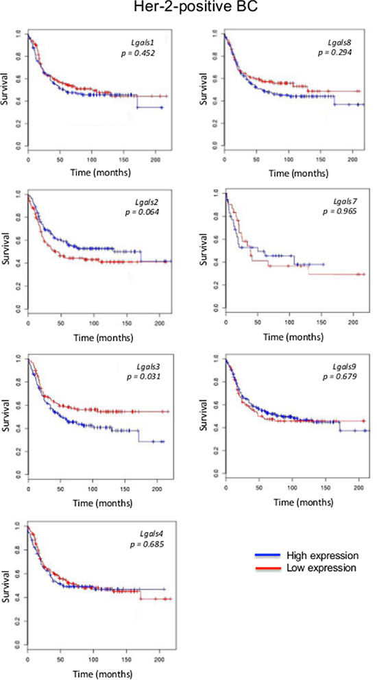 Figure 2: Prognostic role of galectin genes in HER2 breast cancer. Kaplan-Meier estimates of overall survival in HER2 patients expressing low or high galectin expression. These figures were generated using BreastMark public database.