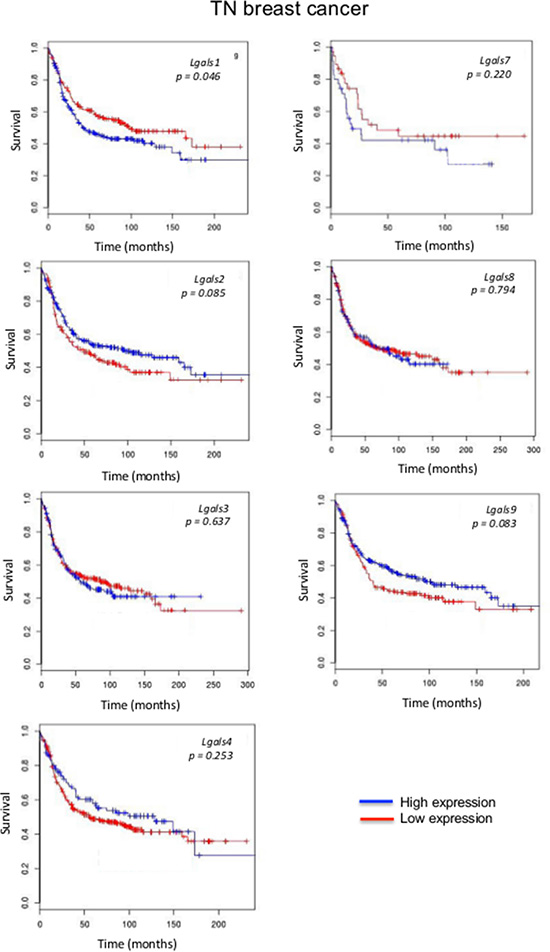 Figure 3: Prognostic role of galectin genes in triple-negative breast cancer. Kaplan-Meier estimates of OS in TNBC patients expressing low or high galectin expression. These figures were generated using BreastMark public database.