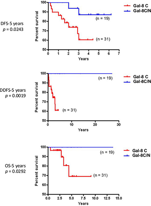 Formalin-fixed paraffin-embedded material from each primary tumor sample was used to construct tissue microarrays with an automated arrayer design to construct high-density tissue micro-array blocks (ATA-27 Beecher Instruments, Sun Prairie, WI). To that end, triplicate 1 mm cores from each tumor and control tissues were punched out and arrayed into six recipient blocks. For immunohistochemical analysis, three-micrometer thick sections were prepared from each TMA. Immunostaining reactions for each galectin were carried out using the Discovery XT automated immunostainer (Ventana Medical Systems, Tucson, AZ). Deparaffinized sections were incubated in cell conditioning pH 8, except for anti-galectin-2 (pH 6), for antigen retrieval and then with primary antibodies for 1 to 3 hrs: mouse monoclonal anti-galectin-1 (1:50; Novocastra, Leica Biosystems, Newcastle Upon Tyne, United Kingdom), rabbit polyclonal anti-galectin-2 (1:100; Proteintech Group, Chicago, IL, USA), rabbit monoclonal anti-galectin-3 (1:1000; Abcam, Cambridge, MA, USA), goat polyclonal anti-galectin-4 (1:200; Santa Cruz, Santa Cruz, CA, USA), goat polyclonal anti-galectin-7 (1:1000; R&D Systems, Minneapolis, MN, USA), rabbit polyclonal anti-galectin-8 (1:50; Abcam) and rabbit polyclonal anti-galectin-9 (1:100; Abcam). The slides were counterstained with hematoxylin and bicarbonate. Each section was scanned at a high resolution using the Nanozoomer Digital Pathology (Hamamatsu, Bridgewater, NJ). The validation of antibodies specificity was assessed using a tissue microarray of 21 different human normal tissues. Positive and negative controls were evaluated according to publications. The omission of the primary antibody was also used as a negative control. All antibodies were validated by their respective company and anti-galectin-1, 2, 3, 4 and 7 were used in previous publications [20, 44–49].