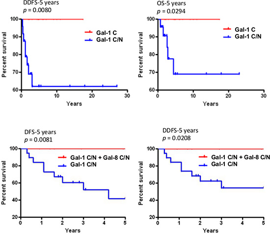 We next performed an mRNA survival analysis for each galectin using the Breastmark RNA expression database and algorithm that facilitate investigation of prognostic markers in the context of disease-free survival (DFS), distant disease-free survival (DDFS) and overall survival (OS) [14]. An initial search was performed for breast cancer as a whole, independently of the lymph node status and across the molecular subtypes classified according the PAM50 molecular classifier [15]. Generation of Kaplan-Meier surviving plots showed no significant differences of DFS between groups of patients with high or low expression level of genes encoding gal-2, -3, -4, -7, -8, and -9 (Supplementary Figure S2). The only notable difference was seen in patients with higher expression of mRNA level of lgals1. These patients had a significantly lower (p = 0.016) DFS than patients with negative/low levels of lgals1, consistent with previous observations that galectin-1 expression correlates with a poor prognosis in breast cancer [16]. High expression of lgals1 is indeed a poor prognostic factor for both lymph node (LN)-positive and negative breast cancer (Table 1).