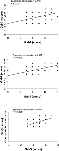 Figure 10: Correlation between galectin-1, -3, and -9 expression in breast cancer tissues. Correlations were measured across the molecular subtypes.