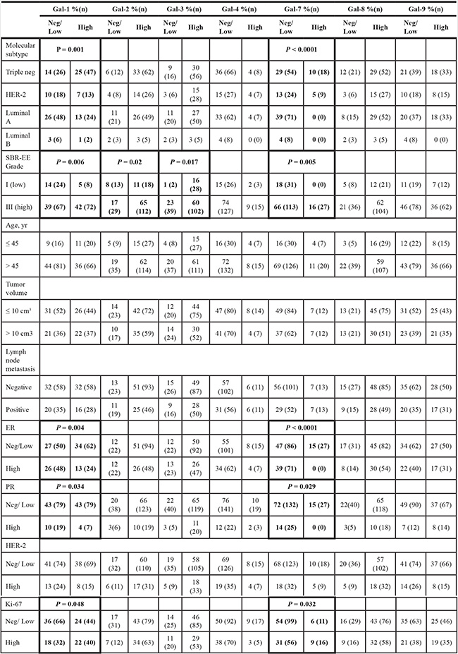 Our study is the first study that provides a detailed analysis of the galectin protein signature in molecular subtypes of breast cancer. This signature is clearly different from the mRNA signatures obtained from in silico analyses of public databases [41]. For example, our analysis using the bc-GenExMiner database shows that gal-1, -2, -3, -4, -7, -8, and -9 were all expressed at the mRNA level in breast tumor tissues and had a relatively similar distribution among the molecular subtypes. While such databases clearly helps in our understanding of breast cancer and facilitate the identification of novel intrinsic subtypes, caution should be exercised when evaluating the prognostic or therapeutic potential of a given gene, especially genes encoding multifunctional proteins like galectins. A case in point is the relevance of measuring cytoplasmic versus nuclear gal-8 or gal-1 staining. This is a critical issue given that a considerable amount of efforts are underway for the development of galectins inhibitors for the treatment of cancer.