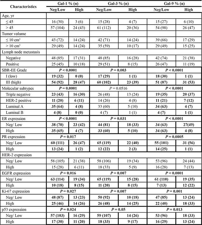 Triple-negative breast cancer is among the most aggressive breast cancer subtypes. To date, there is no clinically available targeted therapy for patients diagnosed with TNBC and approximately 30% of TNBC patients eventually experience distant relapse. The heterogeneity of TNBC makes predicting treatment difficult and remains a major obstacle for the development of TNBC-specific therapeutic targets. In this study, we report that specific galectin expression signatures at the mRNA and protein levels contribute to the phenotypic heterogeneity of TNBC and segregate subsets of aggressive breast cancer into clinically meaningful subtypes.