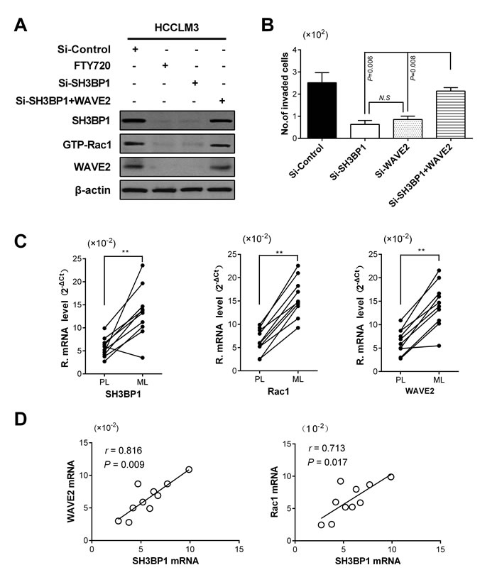 Figure 3: SH3BP1 facilitated HCC invasion and metastasis via Rac1-WAVE2 pathway. A. SH3BP1-depleted and Si-Control HCCLM3 cells whole-cell lysates was measured by Western blotting. No signal for WAVE2 was detected in the whole-cell lysates when SH3BP1 depletion but Rac1 specifically suppressed alone by FTY720. B. WAVE2-overexpressed SH3BP1-depleted HCCLM3 transfected with WAVE2 plasmid in Si-SH3BP1 group exhibited behaviors of cell motility and invasion similar to the cells in Si-Control group in vitro (P < 0.05). C. Comparison of SH3BP1, Rac1, and WAVE2 expressions between paired PL and ML tissues (n = 10). Relative mRNA levels of these genes were significantly increased in the ML tissues. Statistical analyses were carried out using a paired Student’s t-test, **P < 0.01. D. A positive correlation was found between SH3BP1 expression, Rac1 expression and WAVE2 expression (r = 0.713, P = 0.017; r = 0.816, P = 0.009, respectively). PL: primary lesions; ML: Intrahepatic metastasis lesions.