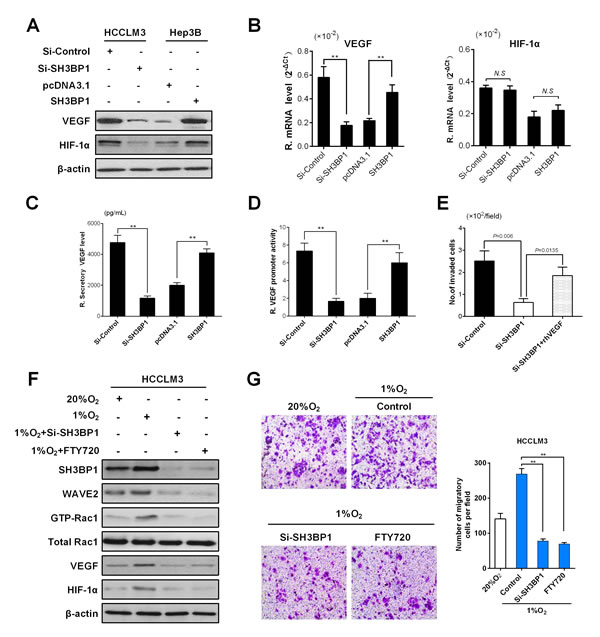 Figure 4: SH3BP1 induces VEGF secretion, activation of VEGF promoter and increase HIF-1α expression enhanced HCC aggressiveness. A. Using Western blot assay, accompanied by depleted SH3BP1 protein levels, VEGF and HIF-1α protein levels decreased in HCCLM3 cells. On the contrary, the evidence showed that decreased VEGF and HIF-1α protein levels when compared with SH3BP1-Hep3B and parental Hep3B cell lines. B. VEGF mRNA levels (left), but not HIF-1α mRNA levels (right), were changed in Si-SH3BP1-HCCLM3 or ectopic SH3BP1 Hep3B cells when compared with controls by qRT-PCR analysis. C. At the protein level, the secretion of VEGF was significantly increased in HCCLM3 and ectopic SH3BP1-Hep3B group was measured by ELISA. D. Full lengths of VEGF promoter were employed for the examination of the promoter activity on SH3BP1 activation in each group HCC cells. E. Si-SH3BP1-HCCLM3 cells could be elevated by the addition of exogenous rhVEGF (20ng/mL) when compared with Si-SH3BP1 and parental HCCLM3 cell lines using Matrigel invasion assay. F. HCCLM3 cells were treated with Si-SH3BP1 or FTY720 in normoxia (20%O2) or hypoxia (1%O2). SH3BP1, Rac1 and WAVE2 protein were decreased in Si-SH3BP1-HCCLM3 or FTY720 cells when compared with controls by Western blot analysis. (G) Under normoxia (20%O2) or hypoxia (1%O2) conditions, HCCLM3 cells were allowed to invade Matrigel for 24 hours (left). The number of invasive cells was quantified (right). Invasion is expressed relative to the levels observed with normoxic controls.