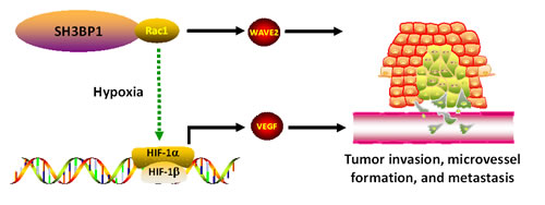 In conclusion, SH3BP1 induces Rac1-WAVE2 signaling to promote tumor vascular invasion and MVD formation related to HCC metastasis. SH3BP1 overexpressed in tumor is significantly correlated to poor prognosis of HCC. SH3BP1 is a novel Rac1-WAVE2 pathway regulator, a prognostic marker and a potential therapeutic target of HCC.