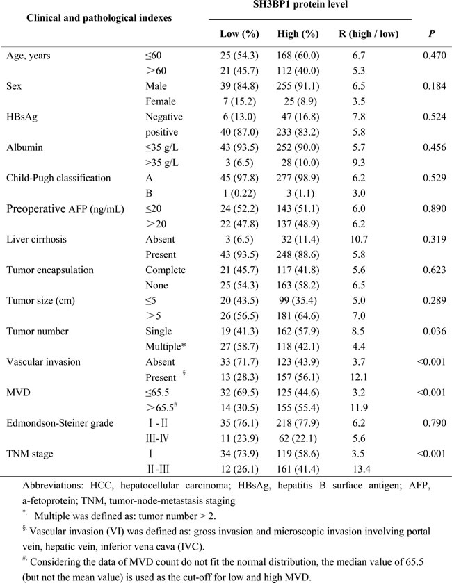 The correlations between SH3BP1 expression and pathological stage in HCC
