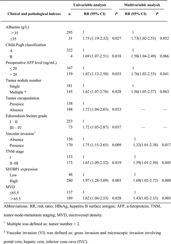 Table 1: Correlations between SH3BP1 expression and clinical and pathological indexes in training cohort 2 of 326 HCC cases