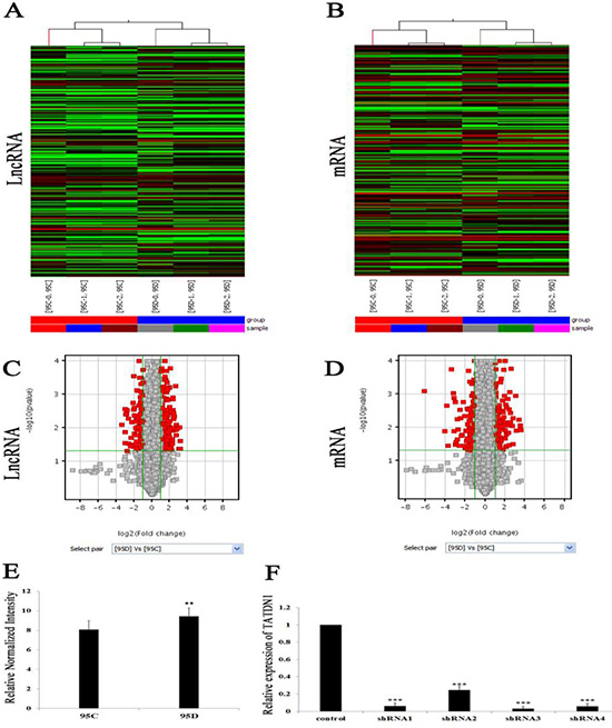 Figure 1: (A–B) Hierarchical clustering showed the expression differences of lncRNA and mRNA between 95D and 95C cells. (C–D) Volcano plot filtering showed the differences in LncRNA expression and mRNA between 95D and 95C cells. (E) TATDN1 was highly expressed in 95D cells than 95C cells. **p < 0.01. ShRNA3 was the strongest blocker (F), ***p < 0.001.