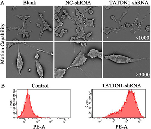 Figure 3: Effect of TATDN1 knockdown on the expression of metastasis-related factors and E-cadherin. Pseudopodium, filamentous cilia (1000 ×) and microvillus (3000 ×) were detected by SEM in 95D cells with Lnc-TATDN1 knocked down (A). The expression of E-cadherin in TATDN1 shRNA 95D cells was detected by Flow cytometry (B).