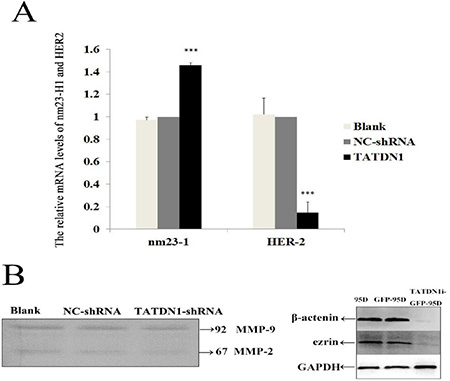 Figure 4: Effect of TATDN1 knockdown on the expression HER2, MMP2/9, β-catenin and ezrin in 95D cells. (A) HER2 mRNA level was detected by RT-PCR analysis ***p < 0.001. (B). The active MMP-2 and MMP-9. (B) β-catenin and ezrin proteins were detected by Western bolt analysis.