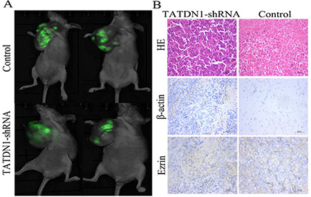 Figure 5: Effect of TATDN1 knockdown on tumor growth and metastasis in a 95D mouse model. The mice were injected with the 95D cells transfected with shRNA against TATDN1. The tumor growth were measured by MicroSPECT analysis (A). The expression levels of β-catenin and ezrin protein were analyzed by IHC (B).