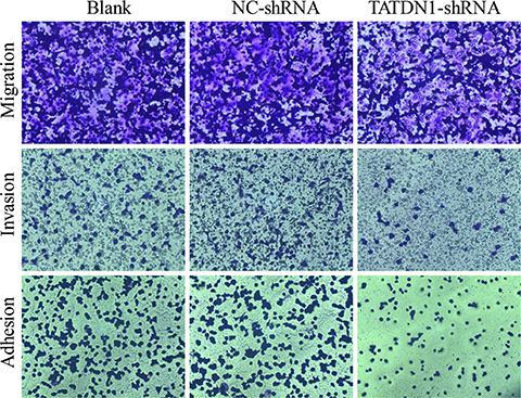 Cell invasion is a significant aspect of cancer progression and involved in the migration of tumor cells into contiguous tissues and the dissolution of extracellular matrix proteins. To examine whether TATDN1 has a direct role in facilitating 95D cells adhesion, migration and invasion, we evaluated the effect of TATDA1 inhibition on cell adhesion and invasion by Matrigel and on migration by transwell. As shown in Figure 2, inhibition of TATDN1 impeded the adhesion, invasion and migration of 95D cells compared to the control group. These data indicate that TATDN1 could promote the migratory and invasive phenotype of 95D cells.