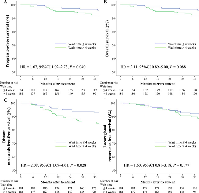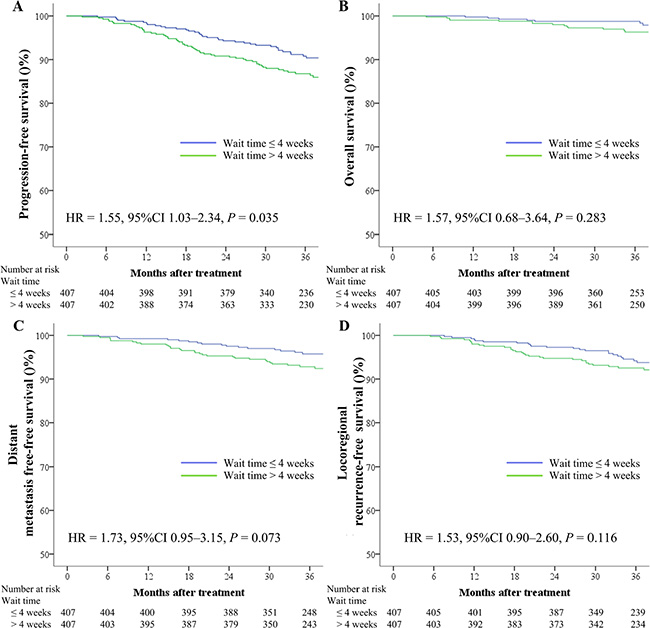Figure 1: Kaplan–Meier survival curves based on the wait time (time between diagnosis and intensity-modulated radiotherapy) for progression-free survival (A), overall survival (B), distant metastasis-free survival (C), and locoregional recurrence-free survival (D) rates for 407 pairs of patients with nasopharyngeal carcinoma. CI = confidence interval, HR = hazard ratio.