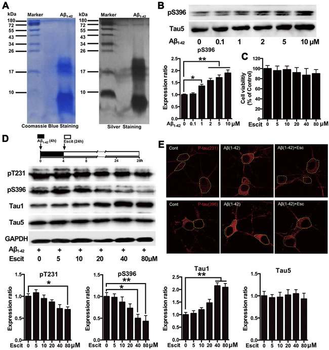 Figure 1: Escitalopram attenuates Aβ1-42-induced tau hyperphosphorylation in hippocampal neurons. A. Representative coomassie blue and silver staining of the Aβ1-42 solution used in the cultured hippocampal neurons. B. Immunoblots of tau phosphorylated at pS396 site in the cultured hippocampal neurons incubated with Aβ1-42 for 4 h at the concentrations indicated. Tau5 was used for normalization. Data were expressed as means ± SEM (n = 3; *p < 0.05, **p < 0.01). B and C. Cells were treated with Aβ1-42 (2 μM) for 4 h, and then incubated with escitalopram at the concentrations indicated for 24 h in fresh medium. Cell viability was detected by the MTT assay (C). Immunoblots of tau phosphorylated at pT231, pS396, Tau1 and Tau5 D. Tau5 or GAPDH was used for normalization. Data were means ± SEM (n = 3; *p < 0.05, **p < 0.01). E. Representative of p-Tau (Thr231) and p-Tau (Ser396) immunofluorescence from the cultured hippocampal neurons incubated with 80μM escitalopram for 24 h in the presence of pretreatment with Aβ1-42 (2 μM) for 4h. p-Tau (Thr231) and p-Tau (Ser396) were labeled with red. Similar results were observed in each of three experiments. Scale bar, 10μm. Escit, Escitalopram.