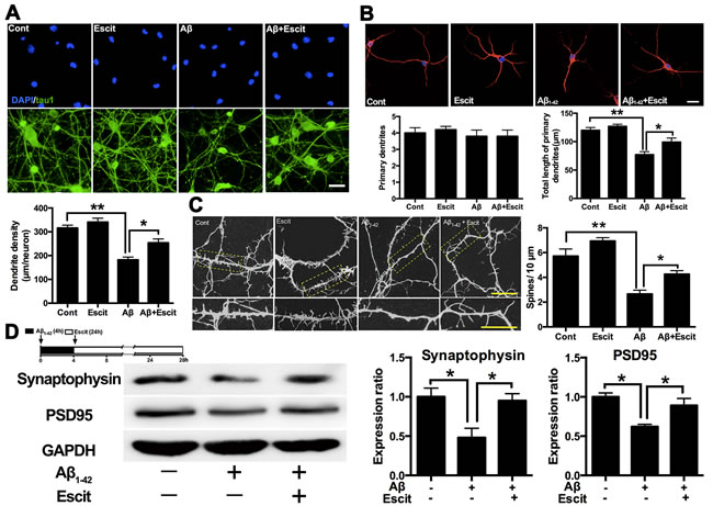 Figure 5: Escitalopram improves Aβ1-42 induced impairment of dendritic outgrowth. A. Dendrite density of the neuron was detected by immunofluorescence assay. Tau 1 was labeled as green and DAPI was blue. Data were represented as means ± SEM (n = 3; **p < 0.01). Scale bar, 10 μm. B. Number of primary dendrites and total length of primary dendrites were examined by immunofluorescence assay. Tau 5 was labeled as red and DAPI was blue. Data were represented as means ± SEM (n = 3; *p < 0.05, **p < 0.01). Scale bar, 5 μm. C. Spine density was detected by immunofluorescence assay labeled with Tau 5. Data were represented as means ± SEM (n = 3; *p < 0.05, **p < 0.01). Scale bar, 5 μm. D. Immunoblots of synaptophysin and PSD95 in the cultured hippocampal neurons. GAPDH was used for normalization. Data were represented as means ± SEM (n = 3; *p < 0.05). Escit, escitalopram.