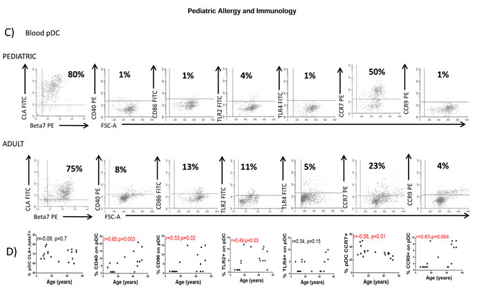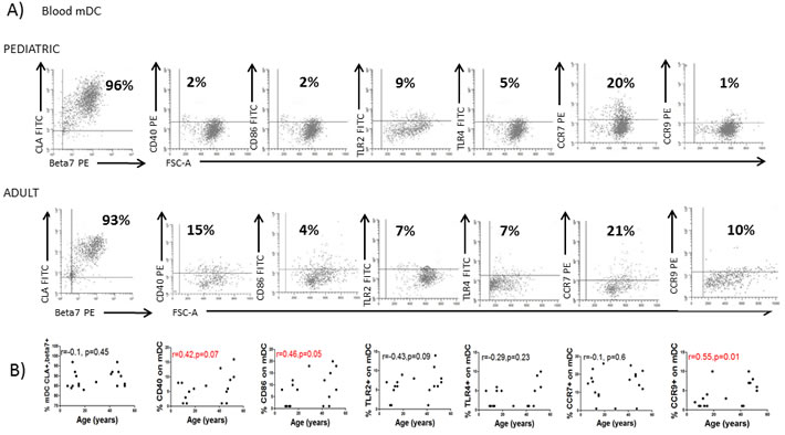 Figure 3: Blood DC changes with the age. A. Blood myeloid dendritic cells (mDC) were identified as in Figure 1A and characterized for the expression of several markers in a representative healthy children and a healthy adult. Pooled data and correlation with the age of the donor is shown in B. C. Blood plasmacytoid dendritic cells (pDC) were also identified as in Figure 1A and characterized for the expression of several markers in a representative healthy children and a healthy adult. Pooled data and correlation with the age of the donor is shown in D. In all cases, the expression of each individual marker is shown as percentage (%). Pearson´s correlation analysis and p-value is displayed. P < 0.05 was considered as statistically significant.