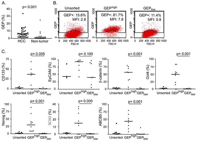 Figure 1: GEP positive HCC cells express stem cell related molecules. Fresh HCC and paralleled non-tumor liver tissues were collected. After enzymatic digestion, cell viabilities were assessed by trypan blue staining, and only cases with high cell viability (viability ≥ 70%) (n = 42/90, 47%) were subject to subsequent characterization. A. Cells isolated from fresh HCC and non-tumor tissues were stained for total cellular GEP and analyzed by flow cytometry (n = 42). B. Cells were sorted according to cell surface GEP. Sorted GEPhigh and GEPlow HCC cells were then permeabilized and stained for cellular GEP using anti-GEP antibody recognizing different epitope from that of the sorting antibody, and analyzed by flow cytometry. Percentage of GEP+ cells and mean fluorescence intensity (MFI) of the unsorted and sorted populations were shown. C. Sorted GEPhigh and GEPlow cells and unsorted control were stained for hepatic surface CSC markers CD133 and EpCAM, pluripotency-associated signaling molecules β-catenin, Oct4, Nanog and SOX2, and drug transporter ABCB5, and analyzed by flow cytometry (n > 7 for each marker). The lines in scatter plots indicated the median values.