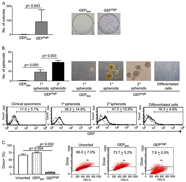 Figure 2: GEPhigh cells possess CSC properties in vitro. A. Sorted GEPhigh cells isolated from freshly resected HCC were able to form more colonies than GEPlow cells (n = 6). In brief, 1000 cells of each freshly sorted subpopulation were seeded onto 6-well plate and allowed to grow for a month. B. Upper panel: GEPhigh cells, but not GEPlow cells, isolated from freshly resected tumors were able to generate primary (1°) spheroids (n = 3). 1° spheroids were collected and dissociated, and 1000 disaggregated cells were allowed to grow for 1 month for generating secondary (2°) spheroids (n = 3). GEPhigh cell-derived, but not GEPlow cells-derived 1° spheroids, were able to generate 2° spheroids. Following induced differentiation, disaggregated cells generated from GEPhigh cell-derived 2° spheroids differentiated and grew as adherent cells. Lower panel: Flow cytometric analysis showed the enrichment of GEP expression in mechanically dissociated GEPhigh cells-derived spheroids as compared to the original resected tumors (clinical specimens) and the differentiated adherent counterpart. Briefly, 1000 cells of each freshly sorted subpopulation were seeded into ultra-low attachment 24-well plate, and allowed to grow for 1 month to generate spheroids. C. After exposure to doxorubicin (0.5μg/ml) for 24h, GEPhigh cells retained significantly less doxorubicin than GEPlow cells and unsorted control (n = 3). Data are expressed as mean percentage + SD.
