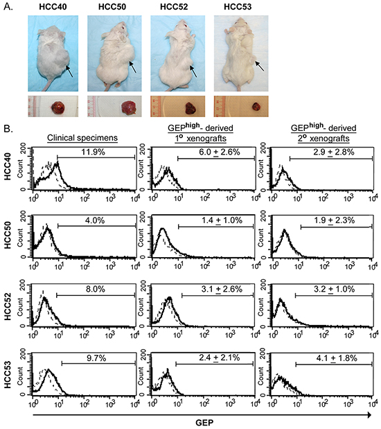 Figure 3: GEPhigh cells possess CSC properties in vivo. GEPhigh and GEPlow cells were sorted from freshly resected tumors of HCC patients and injected into NOD/SCID mice. A. The upper panel shows the NOD/SCID mice injected subcutaneously with 1× 104 GEPhigh (right flank) and GEPlow (left flank) cells at 8-14 weeks after inoculation. Arrow indicated the site of tumor formation at the right flank of mice. The lower panel shows the corresponding subcutaneous tumors derived from GEPhigh cells. B. Flow cytometric analysis showed the total cellular GEP expression in mechanically dissociated GEPhigh cells derived-xenograft tumors (1° and 2°) as compared to the original clinical specimens. In brief, to demonstrate the in vivo self-renewal ability of the cells, GEPhigh and GEPlow subpopulations were sorted from xenografts growing from initial inoculation (1° xenografts) and then transplanted into secondary mouse recipients. GEPhigh, but not GEPlow subpopulations, were able to generate secondary (2°) xenograft tumors. Data are expressed as mean percentage + SD.
