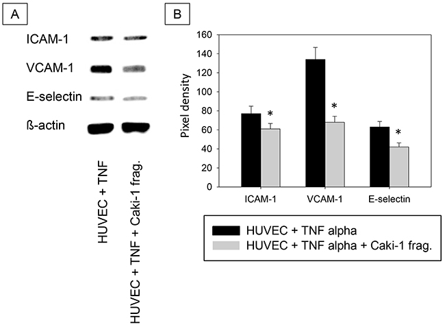 Figure 8: A. Western Blot Analysis. Total protein content of ICAM-1, VCAM-1 and E-selectin in HUVEC cells incubated with TNF-alpha (500 U/ml) and/or Caki-1 cell fragments for 24h. TNF = TNF-alpha, Caki-1 frag. = Caki-1 cell fragments. B. Pixel density of protein bands shown in A.