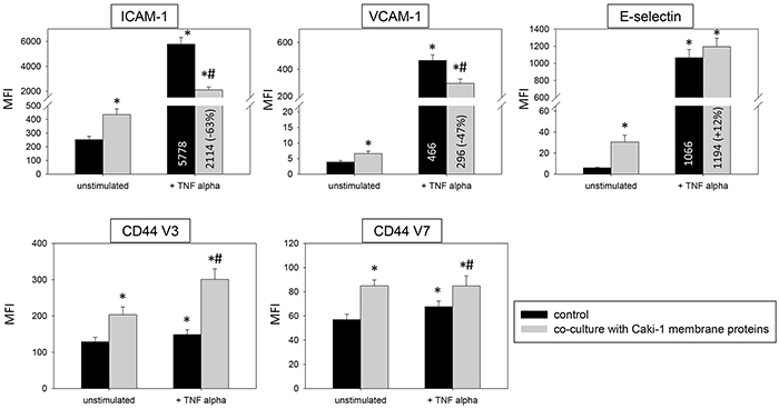 Figure 10: HUVEC conditioning of surface expression by Caki-1 membrane proteins. FACscan analysis of ICAM-1, VCAM-1, E-selectin, CD44 V3 and CD44 V7 after 12h TNF alpha [500 U/ml] stimulation and/or co-cultivation with Caki-1 membrane proteins. MFI = mean relative fluorescence intensity. *indicates significant difference to untreated controls. #indicates significant difference to TNF-alpha stimulated HUVEC. n=5.