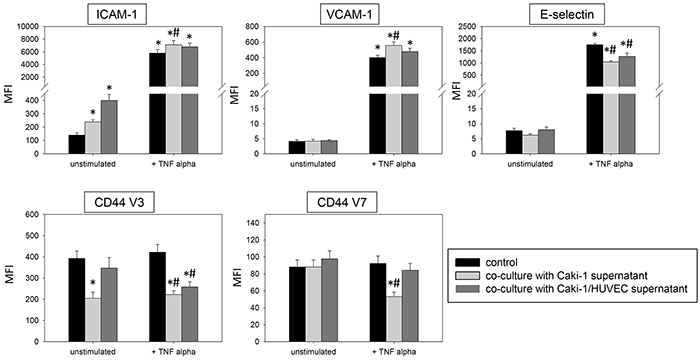 Figure 11: Influence of supernatants (culture medium) from Caki-1 or Caki-1-HUVEC co-culture. FACscan analysis of ICAM-1, VCAM-1, E-selectin, CD44 V3 and CD44 V7 after 12h TNF-alpha [500 U/ml] stimulation and/or co-cultivation with Caki-1 or co-culture supernatants (culture medium). MFI = mean relative fluorescence intensity. *indicates significant difference to untreated controls. #indicates significant difference to TNF-alpha stimulated HUVEC. n=5.