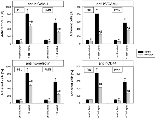 Figure 13: Impact of alteration in endothelial receptor expression on PBL and PMN adhesion to endothelium. 12h stimulation with TNF-alpha [500 U/ml] and/or 1h functional blocking of endothelial ICAM-1, VCAM-1, E-selectin and CD44 by monoclonal antibodies. Unblocked HUVEC cells served as controls. Mean number of adherent PBLs and PMNs from five fields (0.25 mm2) were evaluated and expressed as % of adherent control cells (100%). *indicates significant difference to untreated controls. #indicates significant difference to TNF-alpha stimulated HUVEC. n=5.