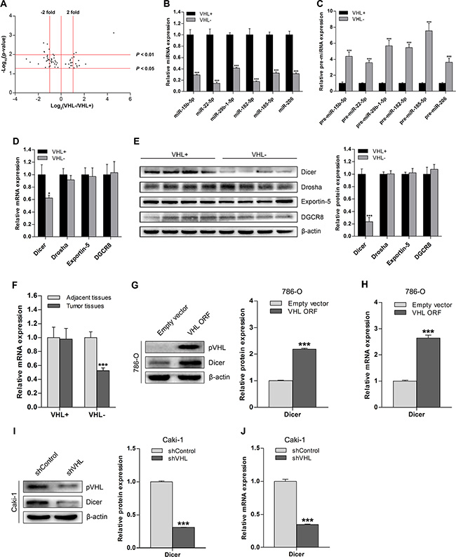 Figure 1: Downregulation of Dicer and its global effect on miRNA in ccRCC is VHL-dependent. (A) Volcano plot of 61 mature miRNAs for which there were significant differences in expression between 8 pairs of VHL− and VHL+ ccRCC tissue samples as assessed by microarray analysis. (B and C) qRT-PCR analysis of expression levels of representative downregulated mature miRNAs and corresponding upregulated precursor miRNAs in VHL− ccRCCs (n = 36) compared to VHL+ ccRCCs (n = 36). (D) mRNA levels of miRNA biogenesis components in VHL− ccRCCs (n = 36) compared to VHL+ ccRCCs (n = 36). (E) Representative immunoblots and quantification of protein levels of miRNA biogenesis components in VHL− ccRCCs (n = 12) compared with VHL+ ccRCCs (n = 12). (F) Dicer mRNA levels in VHL− ccRCCs (n = 36) and VHL+ ccRCCs (n = 36) compared to their corresponding adjacent normal tissues (n = 36 for both groups). (G) Representative immunoblots and quantification of Dicer protein levels in VHL-deficient and pVHL-restored 786-O cells. (H) Dicer mRNA levels in VHL-deficient and pVHL-restored 786-O cells. (I) Representative immunoblots and quantification of Dicer protein levels in wild-type VHL and VHL-knockdown Caki-1 cells. (J) Dicer mRNA levels in wild-type VHL and VHL-knockdown Caki-1 cells. VHL+ denotes wild-type VHL, and VHL− denotes VHL-deficient. Data are presented as mean ± SEM (n ≥ 3). *p < 0.05; **p < 0.01; ***p < 0.001 (Student’s t-test).