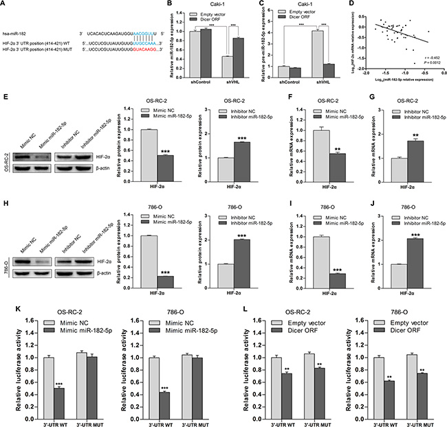 Figure 3: HIF-2α is a direct target of Dicer-dependent miR-182-5p. (A) Schematic representation of the potential binding site of miR-182-5p in the HIF-2α 3′-UTR and its wild type (WT) or mutated (MUT) sequence within the luciferase reporter vector. (B and C) Levels of mature miR-182-5p and precursor miR-182-5p after Dicer ectopic expression (Dicer ORF) in VHL wild-type and VHL knockdown Caki-1 cells. (D) Association between HIF-2α mRNA levels and miR-182-5p levels in ccRCCs (n = 48). (E) Representative immunoblots and quantification of HIF-2α protein levels after miR-182-5p ectopic expression (mimic miR-182-5p) or miR-182-5p inhibition (inhibitor miR-182-5p) in OS-RC-2 cells. (F and G) HIF-2α mRNA levels after miR-182-5p ectopic expression (mimic miR-182-5p) or miR-182-5p inhibition (inhibitor miR-182-5p) in OS-RC-2 cells. (H) Representative immunoblots and quantification of HIF-2α protein levels after miR-182-5p ectopic expression (mimic miR-182-5p) or miR-182-5p inhibition (inhibitor miR-182-5p) in 786-O cells. (I and J) HIF-2α mRNA levels after miR-182-5p ectopic expression (mimic miR-182-5p) or miR-182-5p inhibition (inhibitor miR-182-5p) in 786-O cells. (K) Luciferase activity in OS-RC-2 and 786-O cells transfected with HIF-2α 3′-UTR luciferase reporter vectors with intact or mutated seed sequences in the presence of miR-182-5p mimics or NC, respectively. (L) Luciferase activity in OS-RC-2 and 786-O cells transfected with HIF-2α 3′-UTR luciferase reporter vectors with intact or mutated seed sequences in the presence of Dicer ORF or Empty vector, respectively. ORF = open reading frame. Data are presented as mean ± SEM (n ≥ 3). *p < 0.05; **p < 0.01; ***p < 0.001 (Student’s t-test).