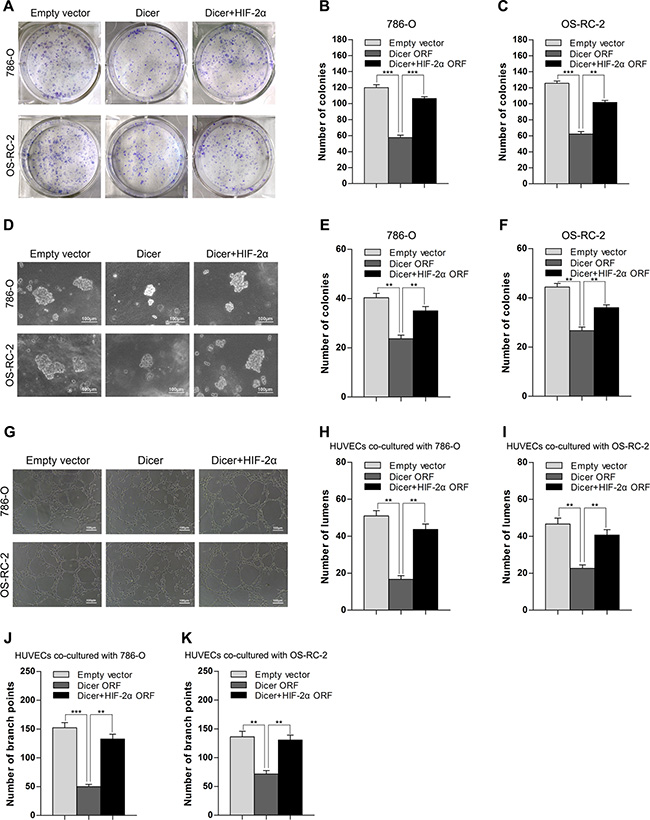 Figure 4: Overexpression of Dicer suppresses the tumor growth and angiogenesis in vitro by reducing HIF-2α in VHL-deficient ccRCCs. (A–C) Representative images and quantification of an anchorage-dependent colony formation assay after Dicer ectopic expression (Dicer ORF) or Dicer ectopic expression plus HIF-2α rescue (Dicer + HIF-2α ORF) in 786-O and OS-RC-2 cells. (D–F) Representative images and quantification of anchorage-independent growth in a soft agar assay after Dicer ectopic expression (Dicer ORF) or Dicer ectopic expression plus HIF-2α rescue (Dicer + HIF-2α ORF) in 786-O and OS-RC-2 cells. (G–K) Representative images and quantification of a tube formation assay (number of lumens or branch points) in HUVECs co-cultured with 786-O or OS-RC-2 cells after Dicer ectopic expression (Dicer ORF) or Dicer ectopic expression plus HIF-2α rescue (Dicer + HIF-2α ORF). ORF denotes open reading frame. Data are presented as mean ± SEM (n ≥ 3). *p < 0.05; **p < 0.01; ***p < 0.001 (Student’s t-test).
