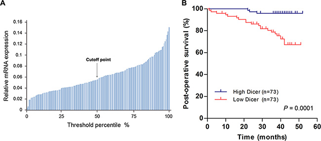Figure 6: Lower Dicer levels predict shorter post-operative survival in VHL-deficient ccRCC patients. (A) Dicer mRNA levels in 146 ccRCCs with VHL mutations or methylation of VHL promoters are shown; the median Dicer mRNA level served as the cutoff point between “High Dicer” and “Low Dicer” groups. (B) Kaplan–Meier survival curves for VHL-deficient ccRCC patients patients with high (n = 73) and low (n = 73) Dicer mRNA levels (p = 0.0001; log-rank test).