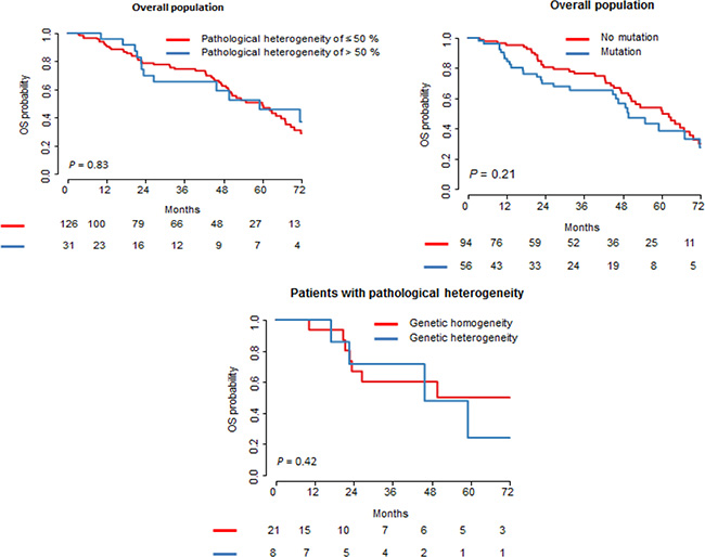 Figure 1: Survival curves according to the PR and genetic status. There was no statistical difference in the overall survival between patients with and without pathological heterogeneity, and between patients with and without mutation. In the patients with pathological heterogeneity, there was also no difference in the overall survival between patients with and without genetic heterogeneity.
