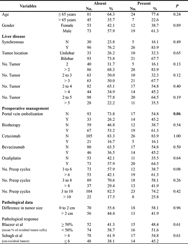 Numerous classical factors including carcinoembryonic antigen, maximal tumor size or tumor number…, are associated with recurrence and poor survival while some recent studies have questioned their prognostic value. There is increasing evidence that the PR to preoperative chemotherapy is a major determinant of outcome after resection [3–6], independently of others prognostics factors. This study showed that pathological heterogeneity was not associated with PR. This could explain that the pathological heterogeneity did not impact the overall survival.