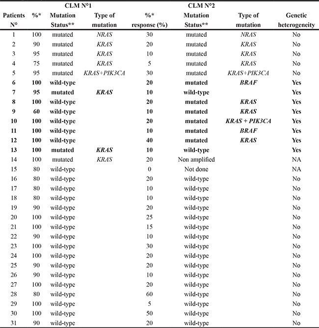 In the patients with pathological heterogeneity (N = 31), genotyping was available from the two most heterogeneous CLM in 29 patients. In the remaining 2 patients, the mutational status was available in only one CLM: In the first patient having 2 CLM, one CLM was not tested because of a complete response and the second CLM did not exhibit mutation. In the second patient, one CLM exhibited a KRAS mutation and the DNA from the second CLM was unamplified.