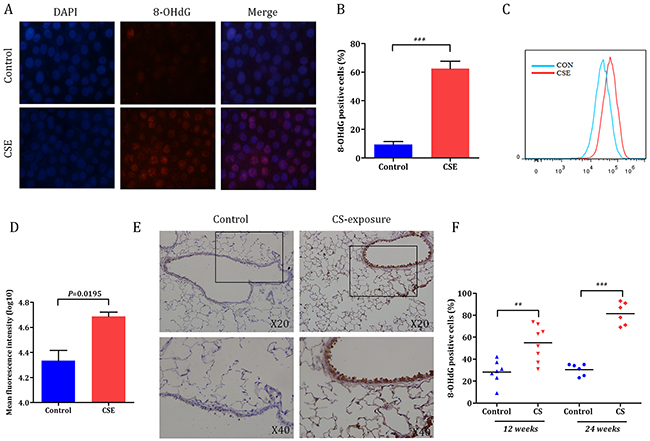 Figure 1: Cigarette smoke-induced oxidative DNA damage response in bronchial epithelial cells. A. Representative microphotograph of HBE cells stained with DAPI (blue fluorescence) and anti-8-OHdG antibody (red fluorescence). B. Percentages of 8-OHdG positive cells in control and CSE group were counted (***P < 0.001). C. Oxidative DNA damage response of HBE cells treated with CSE was assessed (FACS, 8-OHdG). D. Significant increased positive of 8-OHdG cells was observed in CSE group than that of controls (P = 0.0195). E. C57BL/6 mice were exposed to smoke for 12 weeks and 24 weeks and oxidative DNA damage response of lung tissues was assessed (IHC, 8-OHdG). F. Percentages of oxidative DNA damage in control and cigarette smoke-exposure group were counted in the lung. Values in the bar graphs are given as mean ± SEM, n=6-8 mice per group; CSE, cigarette smoke extract.