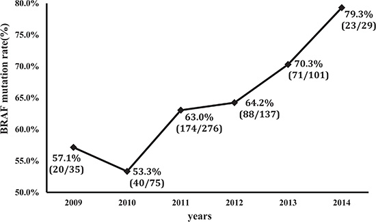Figure 1: Increasing prevalence of BRAF V600E mutation over the time period from 2009 to 2014. The indicated number of papillary thyroid cancer tumors were tested for BRAF V600E mutation from the indicted years. Percentages represent the prevalence of BRAF mutation. In the brackets, the denominator represents the total cases tested and numerator represents the cases positive for BRAF mutation.
