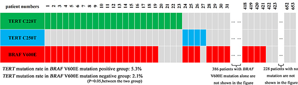 Our PTC cases were included from 2009 to 2014. As shown in Figure 1, there was an interesting increase in the prevalence of BRAF mutation from the early to the recent years in this period of time. As shown in Figure 2, TERT C228T and C250T were mutually exclusive from each other, with the former being dominant, and they were both associated with BRAF V600E mutation. Specifically, among the 27 cases that were positive for TERT promoter mutations, 22 (81.5%) were also positive for BRAF mutation and the prevalence of TERT promoter mutations were 5.3% in the BRAF mutation-positive group versus 2.1% in the wild-type BRAF group (P = 0.05).