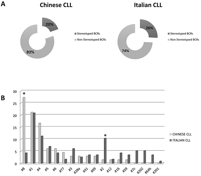 Figure 3: Stereotyped BCRs representation. A. Chinese and Italian stereotyped and non-stereotyped BCRs. B. Frequency of Major subsets in Chinese and Italian series. * marks the significant differences (p values in the text). Data are represented as percentage.