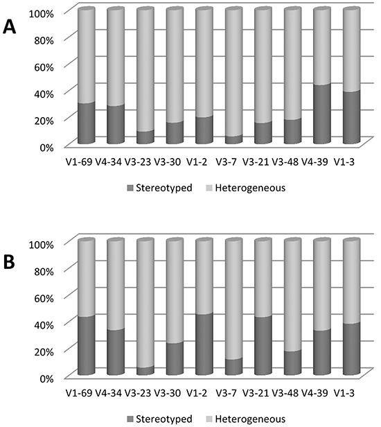 Figure 4. Frequency of stereotyped and heterogeneous BCRs for selected IGHV genes. A. Chinese CLL. B. Italian CLL. Data are represented as percentage.