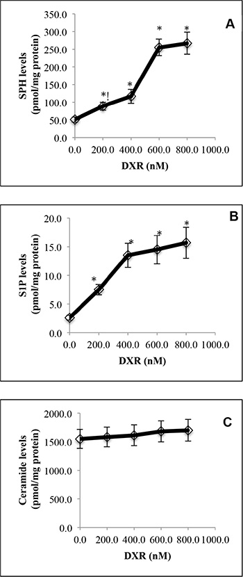 Figure 1: DNA damage by doxorubicin increases SPH and S1P levels in HCT116 cells. HCT116 cells were treated with DXR at 200, 400, 600 or 800 nM or DMSO for 24 h before the levels of SPH (A), S1P (B), and ceramides (C) were determined by LC-MS/MS. Data represent mean values ± SD of 3 independent experiments. *p-values of DXR at different concentrations versus (vs) DMSO.